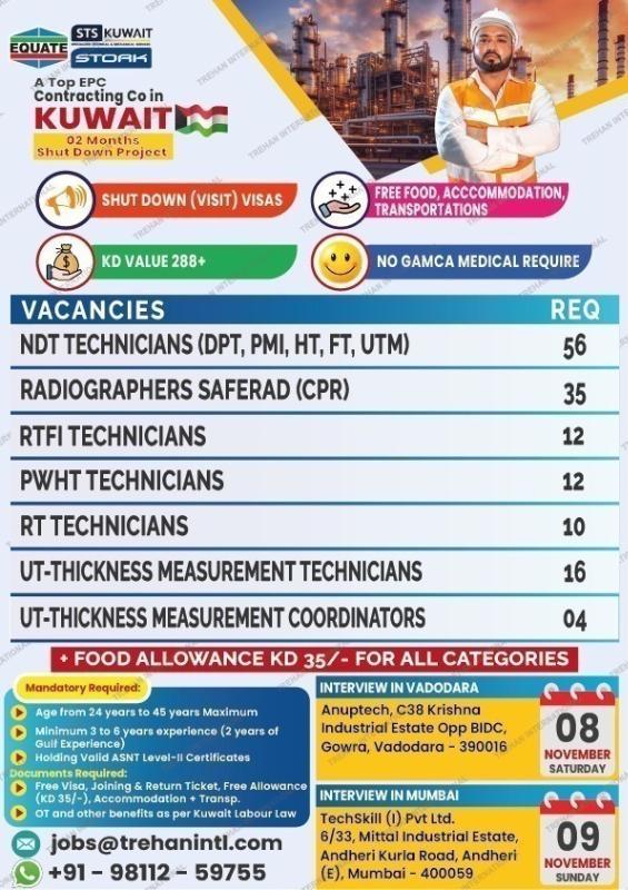 #KuwaitJobs #ShutdownProject #TrehanInternational #VadodaraInterview #MumbaiInterview #GulfJobs #OverseasJobs #EPCProject #HiringNow #WalkInInterview #NDTTechnician #Radiographer #RTFITechnician #PWHTTechnician #RTTechnician #UTThicknessTechnician #UTThicknessCoordinator #OilAndGasJobs #EngineeringJobs #JobAlert #FreeRecruitment #JobsAbroad