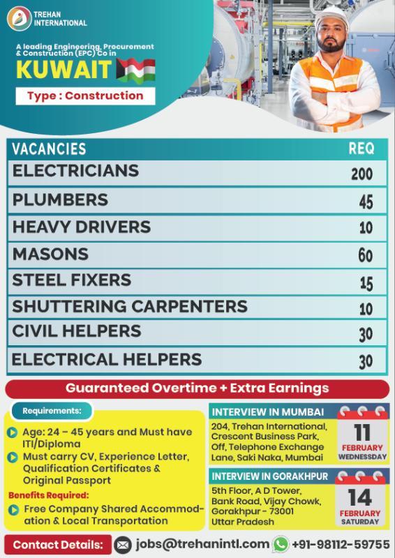 #KuwaitJobs #GulfJobs #EPCProjects #ConstructionJobs #ElectricianJobs #PlumberJobs #DriverJobs #MasonJobs #SteelFixer #CarpenterJobs #HelperJobs #OverseasRecruitment #GuaranteedOvertime #FreeAccommodation #WalkInInterview #TrehanInterna