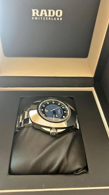 I'm selling my Rado Swiss automatic men's watch, about 1–2 years old. It's in excellent condition with light usage, no noticeable scratches on the steel case or bracelet. The watch has a blue dial with crystal glass, and the metal (silver) bracelet is comfortable and secure. It comes in the original Rado box. Selling because I no longer wear it regularly.