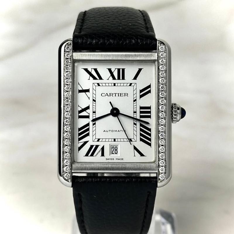 Custom aftermarket diamond-set bezel adds refined sparkle and presence while retaining the Tank’s timeless elegance.