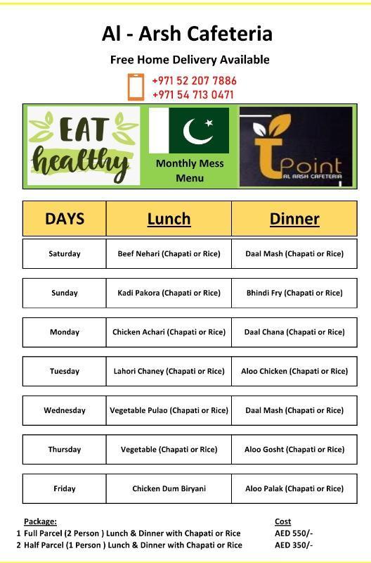 Hello we are providing mess service breakfast lunch dinner you can choose from.. pakistani food.. good homely taste.. very reasonable..in deira area and surrounding areas..with free home delivery.. WE ALSO TAKE PARTY ORDERS..please watsapp for more information.