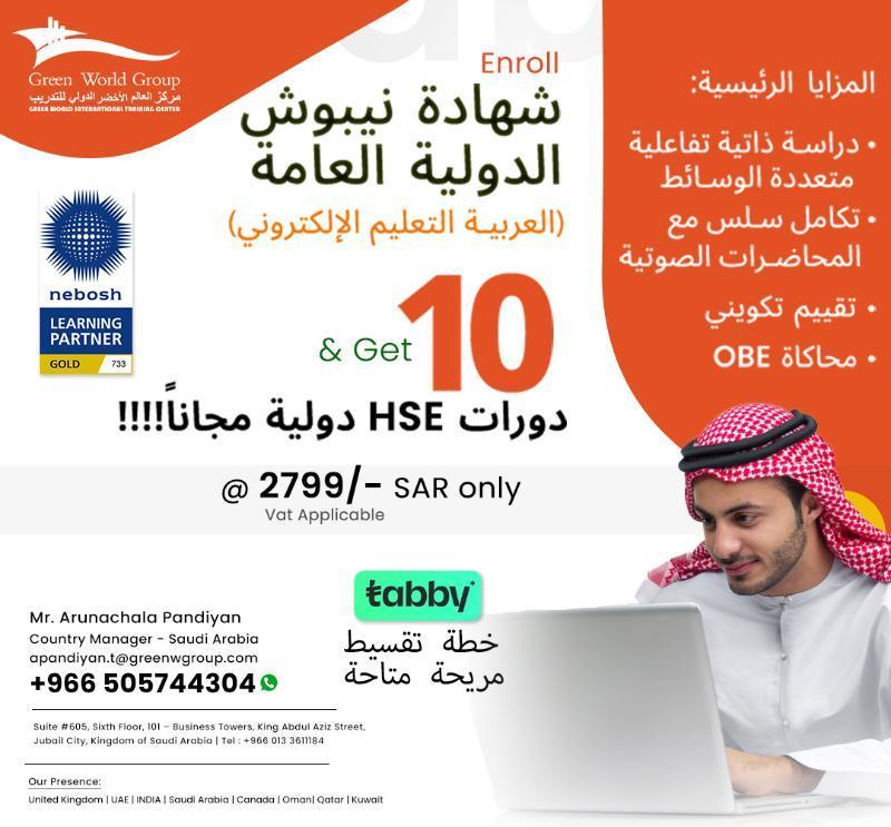NEBOSH IGC course in Arabic, provided by Green World Group in Saudi Arabia. This globally recognized