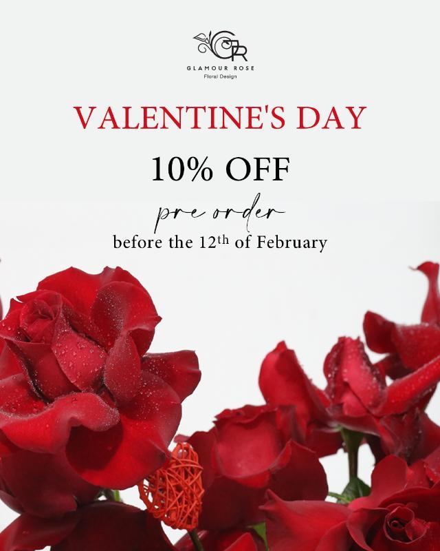 Celebrate love with Glamour Rose, Dubai’s premier flower shop! This Valentine’s Day, surprise your special someone with a breathtaking bouquet of fresh, hand-picked flowers. Order before February 12th and get 10% OFF on Valentine’s Day bouquets. Make this moment unforgettable with the perfect floral arrangement. Order now for the perfect surprise!