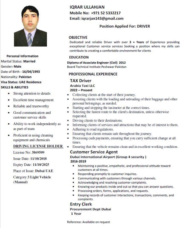 I am currently looking for a job as a Driver. I have 4 years of experience working as a Taxi Driver in Dubai, with a strong knowledge of city routes, traffic rules, and excellent customer service.