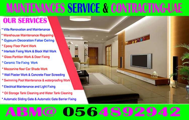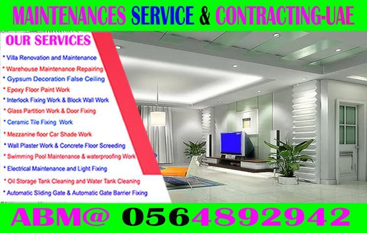 Gypsum Partition & False Ceiling - Building Painting - Hit Proofing Rockwool fixing .Warehouse –Car Parking Epoxy floor Paint - Marine Ship Painting contracting -Air Condition - Duct Installation Central AC - Split AC- Window AC- Water Cooler water & Heaters Installation service. -Electrical Cabling -DB Board Installation and fixing-LCD Fixing Light-LED fixing - Switches & Sockets-all Electrical Fittings Contracting-Civil Masonry & Tiles Fixing-- Interlock Fixing Contracting-Emergency plumbing repairs- Toilet – bath- Drains Block - Water Tank Cleaning and Plumbing -Aluminum Door & Shower Glass Works - Welding & Grilling -windrow Welding & Grilling Fixing - Stair Cress Welding & Grilling Fixing Car Parking Welding & Grilling Manufacturing & Fixing -Swimming Pull Area Grill roof top Clay Tile fixing - Thai Aluminum Temper Glass Installation. Interior INTERIOR company ect. +971564892942